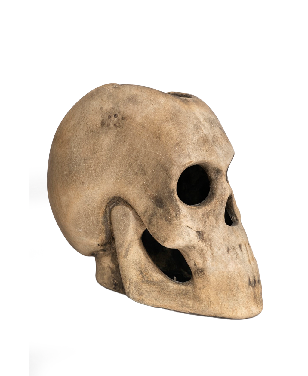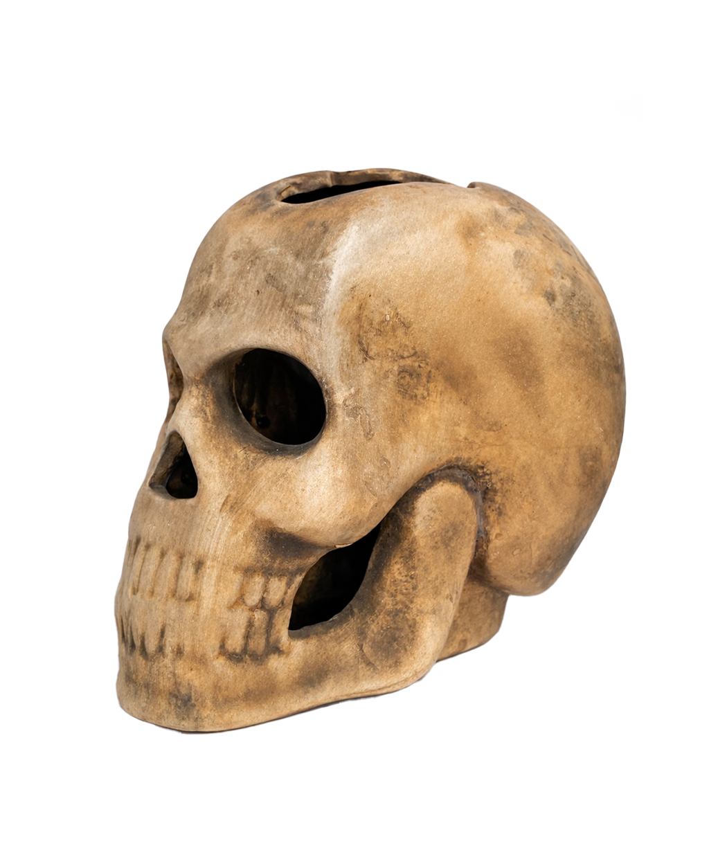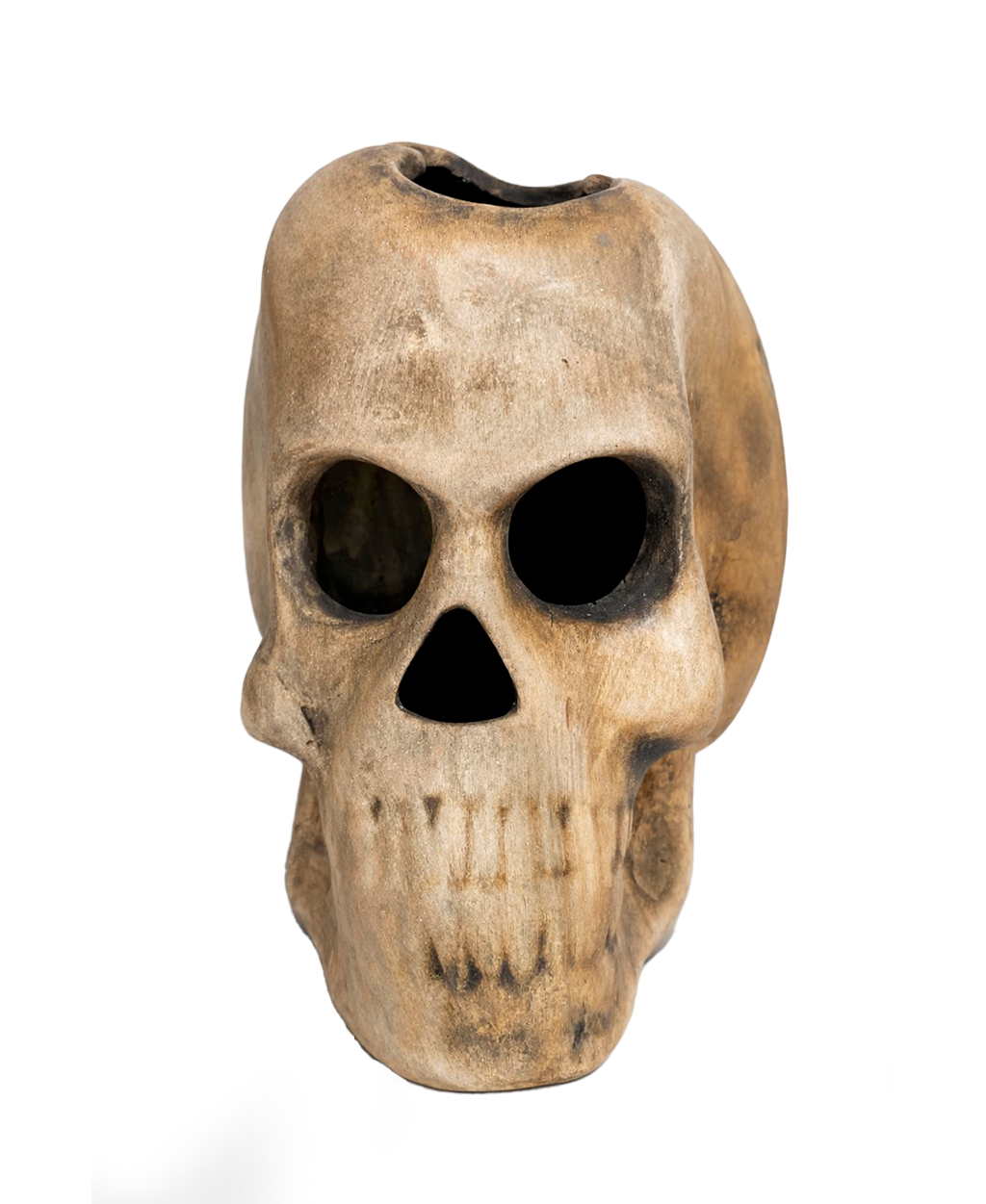 Escultura decorativa em formato de crânio humano, produzida artesanalmente em cerâmica, com alto nível de detalhamento e acabamento realista. A peça apresenta textura envelhecida, com variações sutis de tons terrosos e sombreados naturais, criando um visual autêntico e sofisticado.
