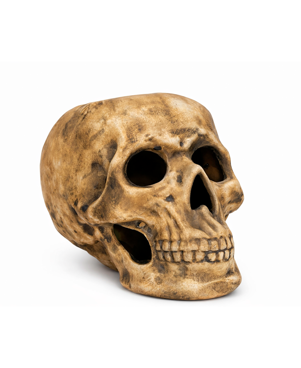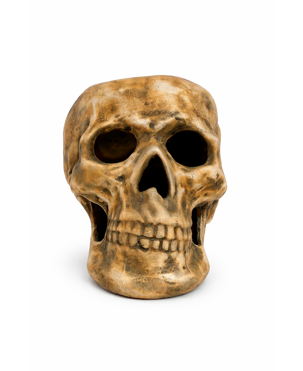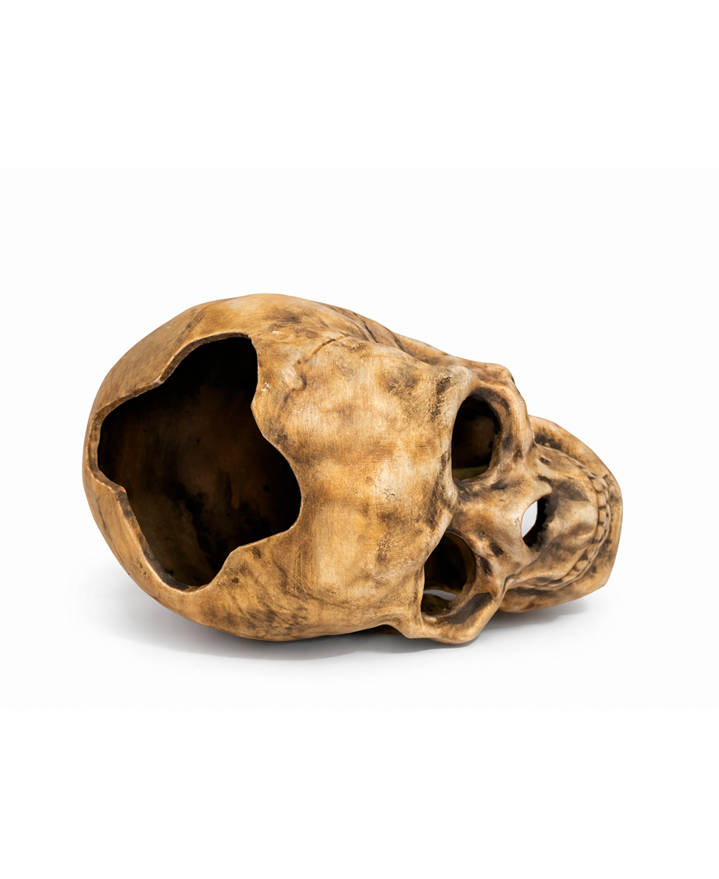 Peça decorativa produzida artesanalmente em cerâmica, com acabamento realista que remete à aparência de um crânio humano envelhecido pelo tempo. O design apresenta alto nível de detalhamento anatômico, com cavidades bem definidas, arcada dentária esculpida e textura irregular que simula desgaste natural.