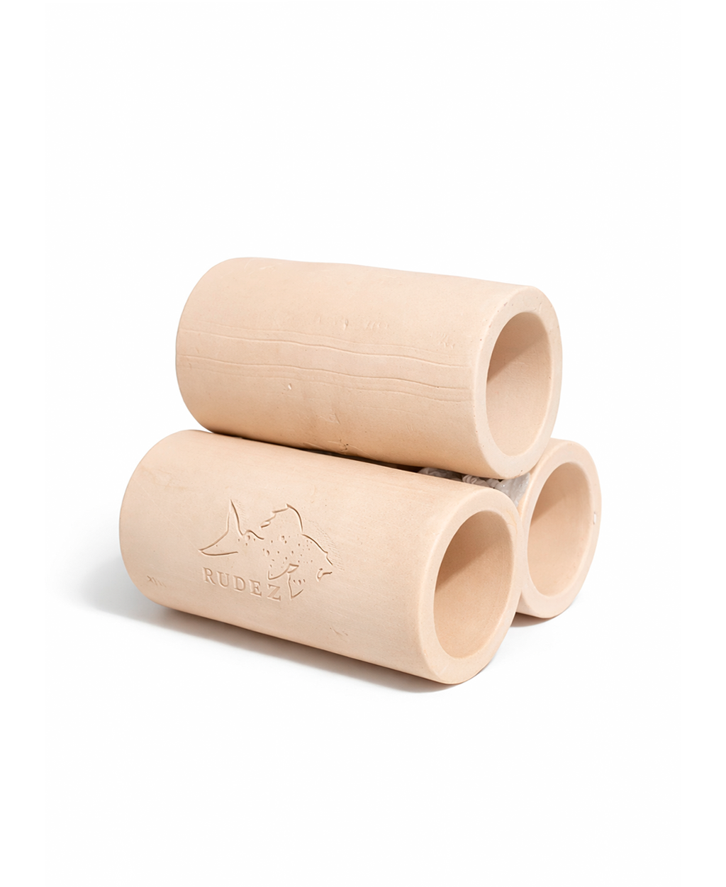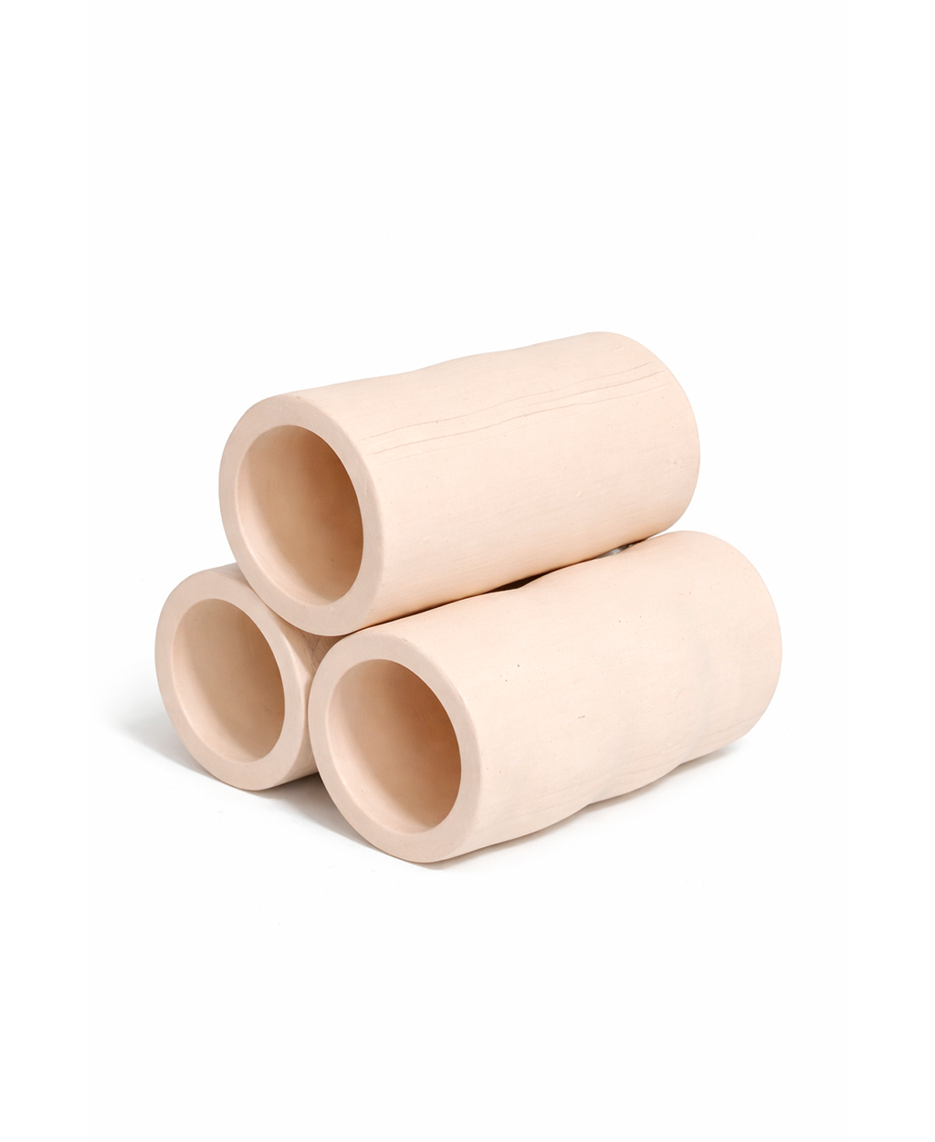 Peça decorativa e funcional produzida em cerâmica natural, composta por três tubos cilíndricos com acabamento artesanal e tonalidade clara, levemente bege. Os cilindros apresentam superfície lisa com discretas marcas do processo manual, o que confere autenticidade e um visual orgânico à peça.